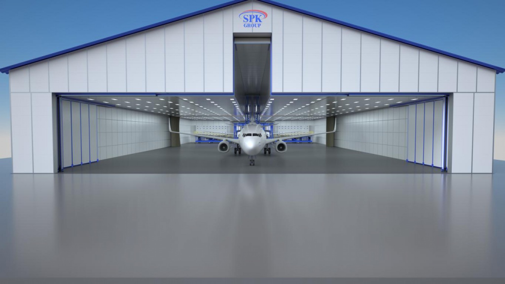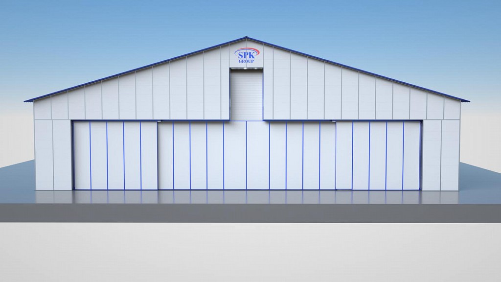 В комплектацию входят двухсекционные утепленные ворота. Общий пролет ворот – 46000 мм. Секции ворот располагаются вертикально. Размеры боковых секции – 24000х8500 мм (2 шт).