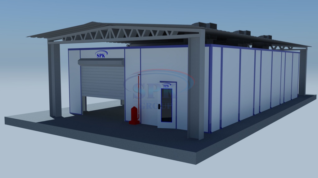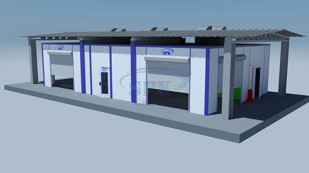 Кабина собирается из металлокаркаса и сэндвич-панелей (толщиной 50 мм). Камера имеет 2 подъемно-секционных ворот (размером 3500х3500 мм) и 2 сервисные двери (размером 800х2000 мм).