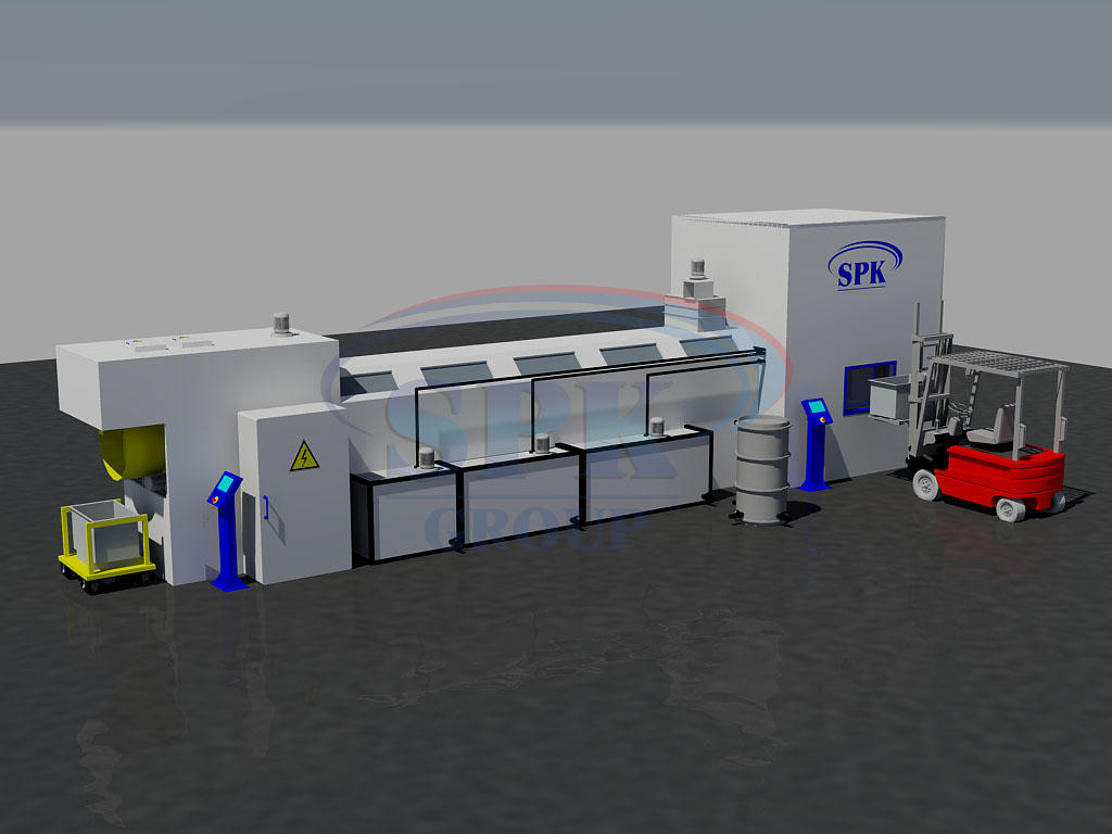 Технологическая линия шнековой очистки и пассивирования служит для автоматического процесса очистки, пассивирования и дальнейшей сушки элементов. Производительность линии - 3000 шт./час.